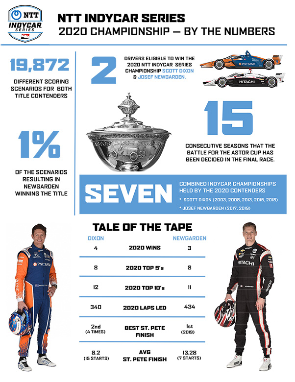 To earn his sixth career title, Dixon has to finish no worse than ninth, assuming Newgarden wins the pole position, leads the most laps and wins the race-earning the maximum 54 points.