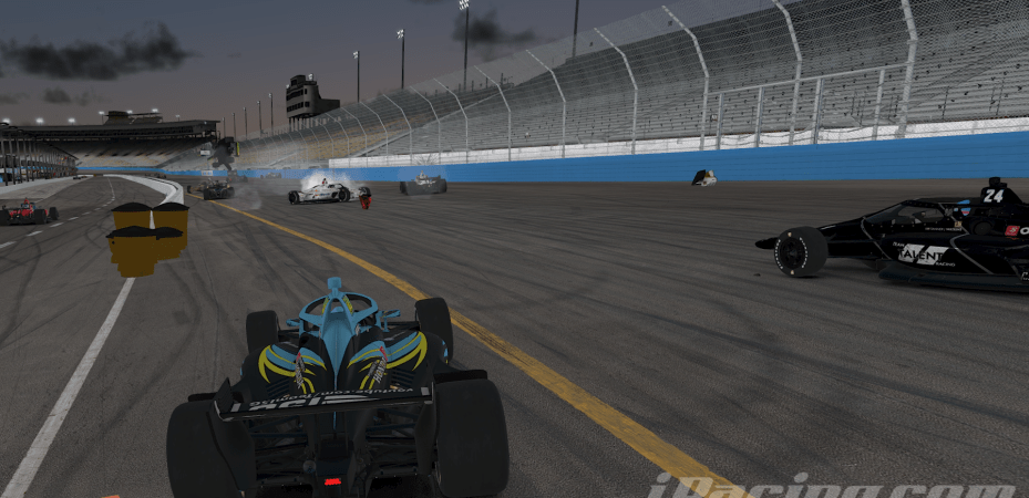 Kinsella, who pitted with Blocker, was making his way forward as well, getting back to 4th place. With just 2 laps to go, Blocker had gotten to within a second of leader Demeritt before the race’s 6th and final yellow would wave after a wild incident coming out of turn 4 that saw several cars get collected. While battling for 14th position, Oisin Walsh would get into the back of Watkins with a total of seven cars getting involved.