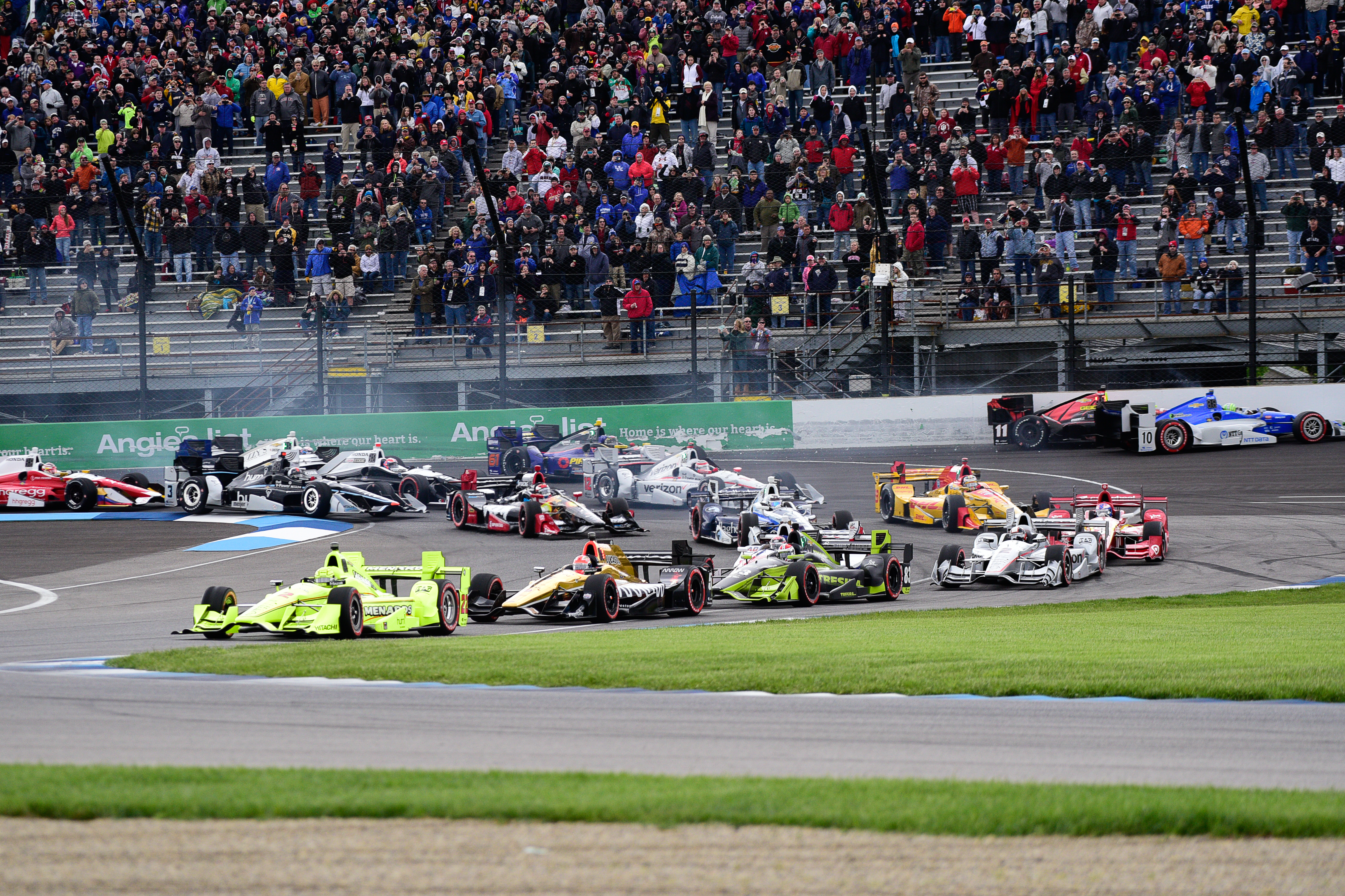 For the third straight year, the opening of the 82-lap race was marred by a multi-car accident. On the front straightaway, Chip Ganassi Racing teammates Scott Dixon and Tony Kanaan made contact, sending Kanaan into KV Racing’s Sebastien Bourdais.