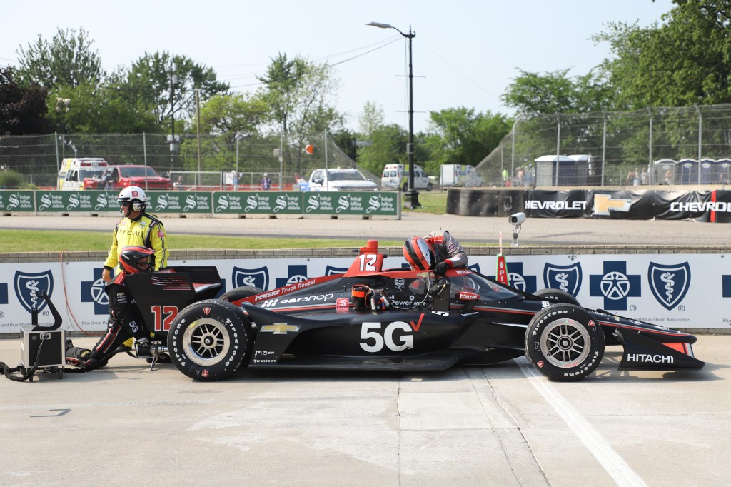 After making his first pit stop, Team Penske’s Josef Newgarden suffered a driveshaft issue. While making a second pit stop, the left-rear tire fell off the No. 2 entry.