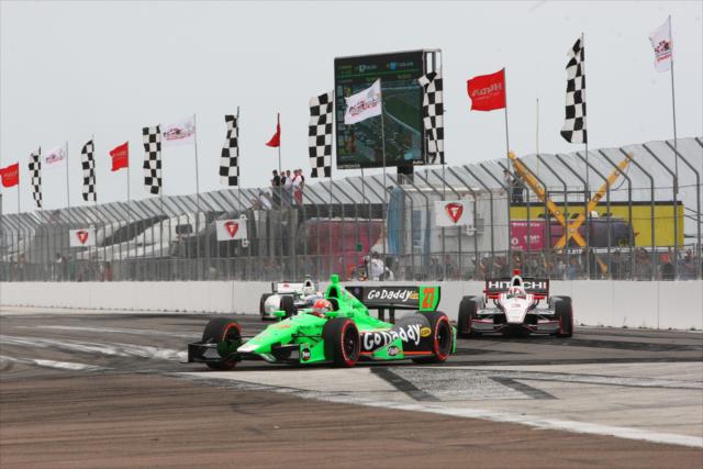 After beating Takuma Sato (making his debut for A.J. Foyt Racing), Team Penske’s Will Power earned his fourth consecutive pole on the temporary course. Looking to begin his journey for a championship that eluded him the season finale each of the prior three years, Power took off and led the opening 26 laps.