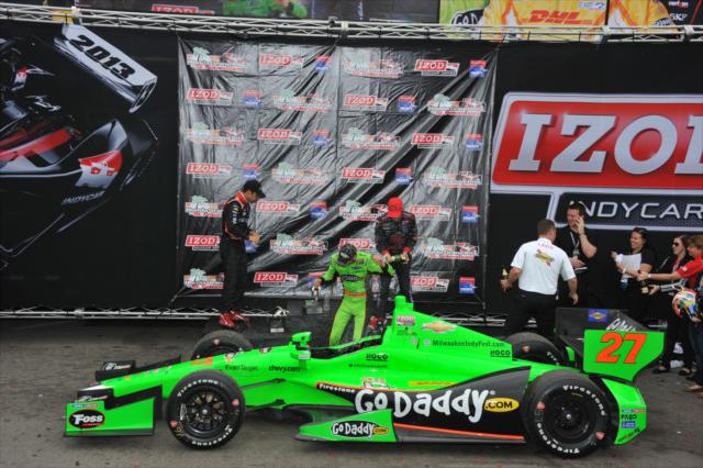 On a day when his widow Susie waved the green flag, the 2005 race winner’s team earned the victory in his adopted hometown. Joining Hinchcliffe and Castroneves on the podium would be Marco Andretti, giving Chevrolet their third podium sweep in their 16th race back and their first on a road or street course since their return the previous season.