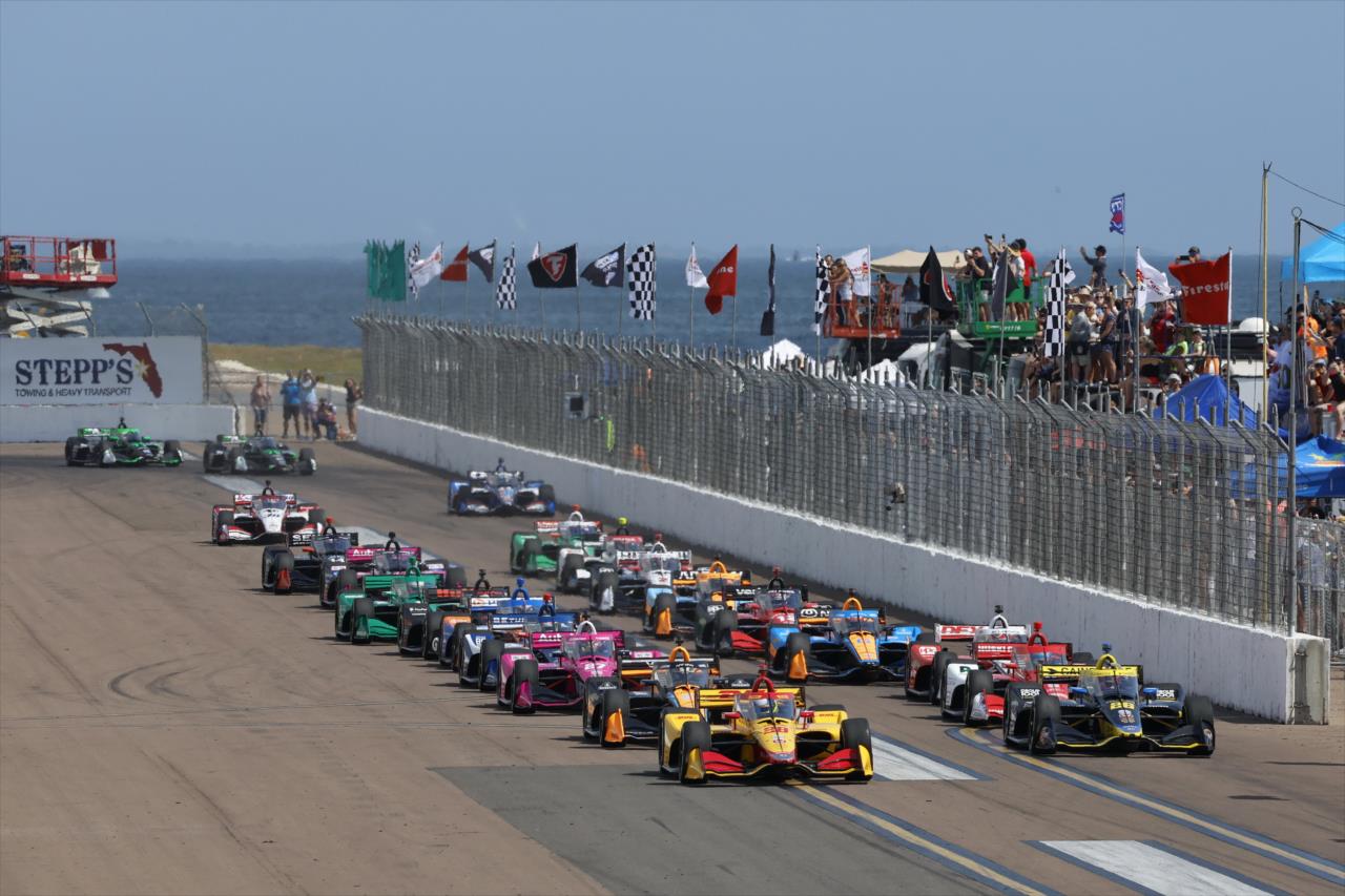In a frantic start, Felix Rosenqvist made contact with Dixon and broke looser on the exit of Turn 3. Further back, a spin by Helio Castroneves following contact with Santino Ferrucci triggered a six-car crash. The incident culminated with Benjamin Pedersen getting Devlin DeFrancesco airborne. Also sustaining damage were Simon Pagenaud and Sting Ray Robb.