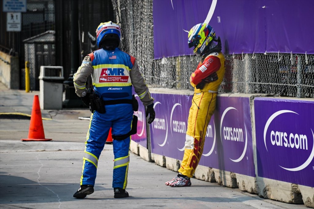 Juncos Hollinger Racing’s Callum Ilott was unable to avoid Kirkwood and rear-ended the No. 27. It would mark the end to Ilott’s first INDYCAR race in Detroit (he missed 2022 in Belle Isle with a broken thumb).