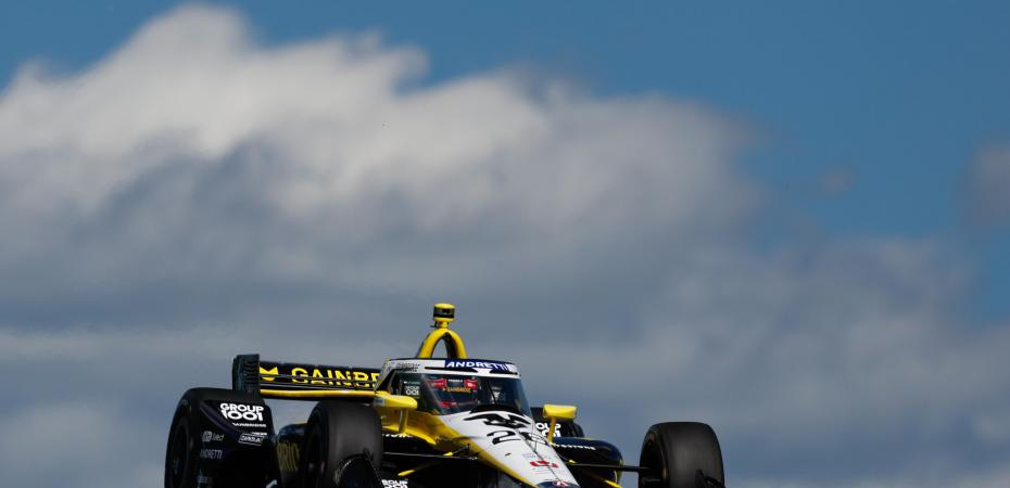 After finishing second in Friday’s opening practice, Colton Herta would lead Saturday morning’s rain-filled 45-minute practice at Road America. The No. 26 Andretti Global entrant posted a best lap of 2m07.3027 (113.512 mph) on the 4.014-mile, 14-turn permanent road course in Elkhart Lake, Wisconsin.