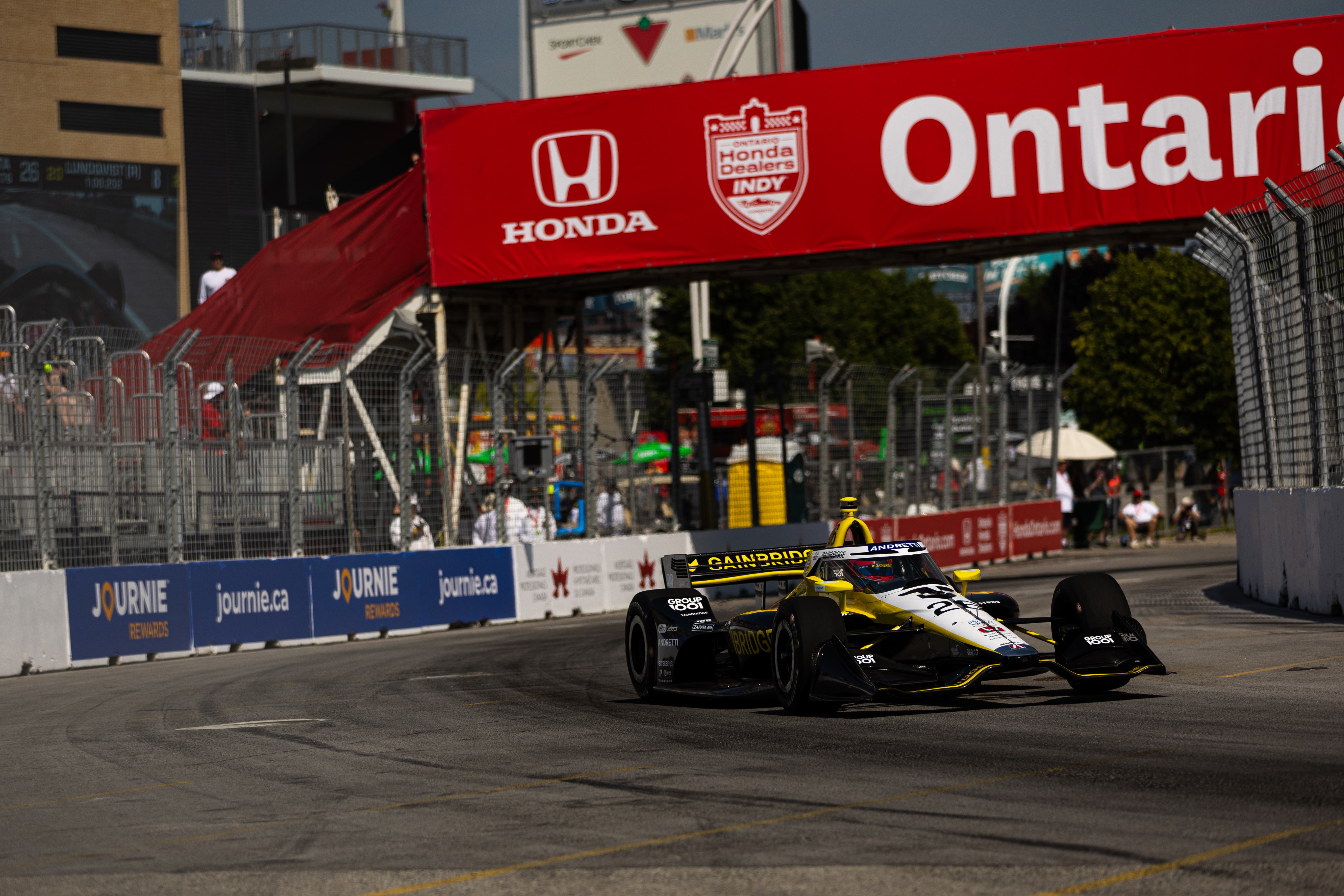 After leading practice sessions on Friday afternoon and Saturday morning, Colton Herta earned the pole for Sunday’s Ontario Honda Dealers Indy Toronto. The Andretti Global driver posted a best lap of 59.5431 seconds (107.982 mph) on the 1.786-mile, 11-turn street circuit at Exhibition Place.