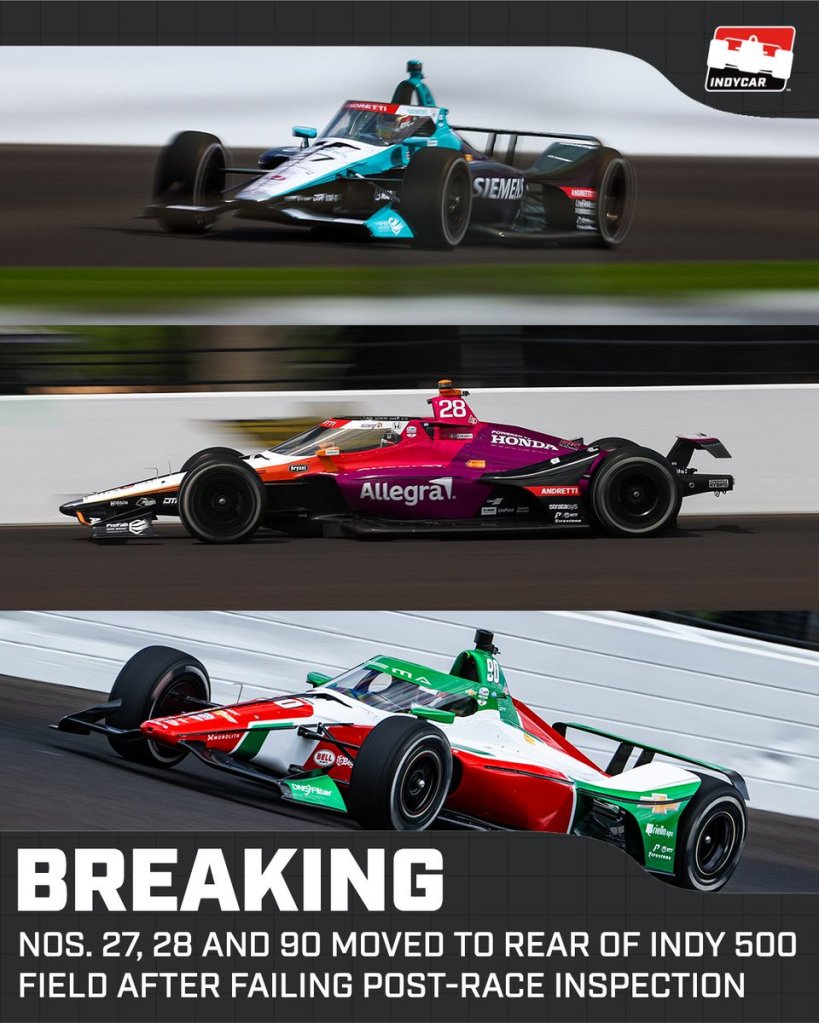 Additionally, each car receives a $100,000 fine and the team/competition managers for the three entries have been placed on a one-race suspension to be served at the next NTT INDYCAR SERIES event at the Streets of Detroit.